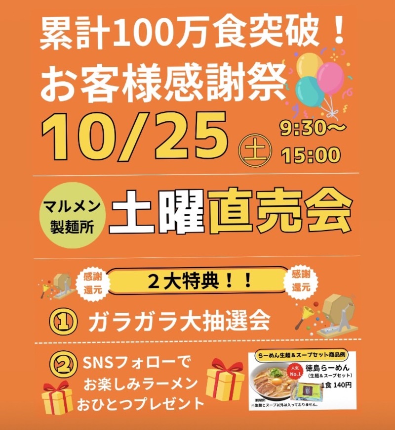 2025年10月25日(土)9:30~15:00土曜直売会 販売予定メニュー 徳島らーめん 140円 ...